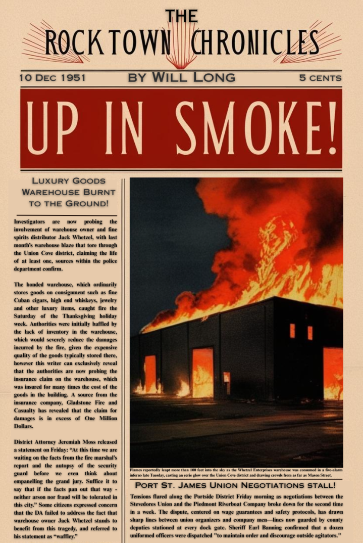 In a city mired in ashes and avarice, Simeon "Sy" Grey languishes at the bottom of a bottle. When a pattern of arsons turns a promising payday into a life-and-death struggle, Sy is thrust into a crucible that will either forge his fortune or seal his fate. Amidst dubious allies and enigmatic foes, he must trust the untrustworthy, never keeping his back to the door. From the ashes of the case, a single clue lures him into a twisted conspiracy, where two-bit thugs and covert powerbrokers vie with the city's elite for more than just money. As Sy closes in on the truth, the flames draw ever nearer, threatening to consume all he has left to lose. In this searing ordeal, Sy builds his case while clinging to a final, unyielding principle-survival. He will have to fight tooth and nail to outlast the inferno of The Rocktown Chronicles: Up In Smoke!